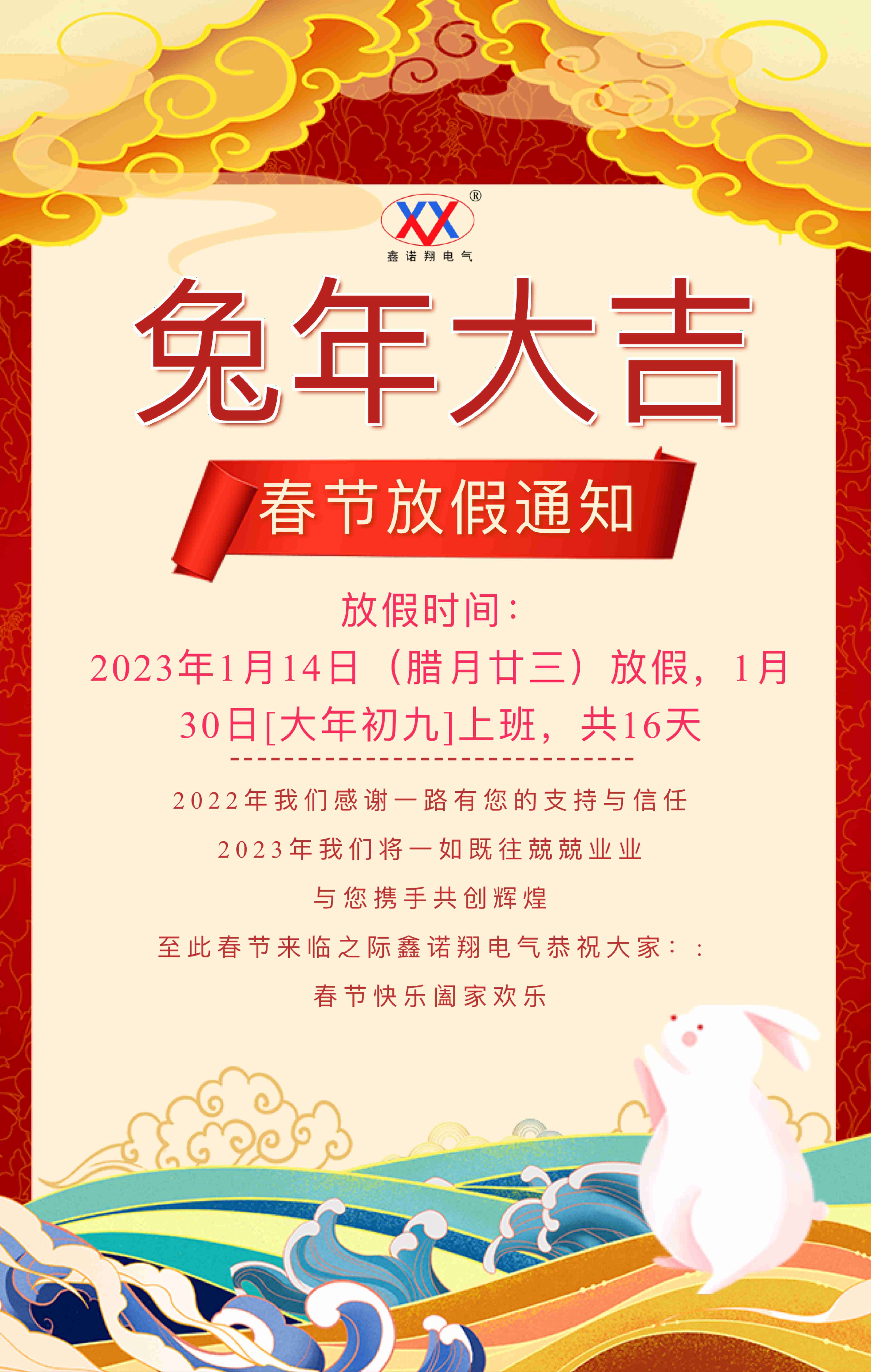 2023年春節(jié)放假通知 各位尊敬的鑫諾翔用戶:大家好! 一年一度的新春佳節(jié)即將來臨,鑫諾翔全體員工向您致以誠(chéng)摯的祝福和問候,提前祝大家新春愉快! 感謝大家長(zhǎng)期以來對(duì)我公司的支持與信任,祝您在即將到來的兔年萬(wàn)事順意,生意興隆,財(cái)源滾滾! 為了讓公司全體同仁度過一個(gè)歡樂祥和的春節(jié),同時(shí)根據(jù)《國(guó)務(wù)院辦公廳關(guān)于2023年部分節(jié)假日安排的通知》中的相關(guān)規(guī)定,結(jié)合我公司實(shí)際情況,我公司2023年春節(jié)放假安排通知如下: 我公司春節(jié)放假時(shí)間為:2023年1月14日(臘月二十三)放假,1月30日(正月初九)上班,共計(jì)16天。 春節(jié)假期內(nèi)我公司不再提供詢價(jià)、報(bào)價(jià)及其他技術(shù)支持服務(wù),不便之處,敬請(qǐng)大家諒解。在春節(jié)休假期間,如有緊急事務(wù),請(qǐng)聯(lián)系王經(jīng)理 13722279995,謝謝!