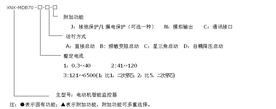 XNX-MDB70系列電動(dòng)機(jī)智能監(jiān)控器是一款智能化、數(shù)字化、網(wǎng)絡(luò)化的控制器。該產(chǎn)品基于微處理器技術(shù),將網(wǎng)絡(luò)通訊技術(shù)和分布式智能技術(shù)溶入MCC控制中心,集電機(jī)智能保護(hù)、運(yùn)行狀態(tài)監(jiān)控、故障記錄及網(wǎng)絡(luò)通訊為一體;可以查看測(cè)量數(shù)據(jù)、報(bào)警信息、故障信息等,并可根據(jù)用戶需要方便的進(jìn)行保護(hù)參數(shù)設(shè)定。能滿足諸多啟動(dòng)方式,在低壓控制終端MCC柜和1/4單元及以上各種抽屜柜中可直接安裝使用。 二、型號(hào)說(shuō)明
